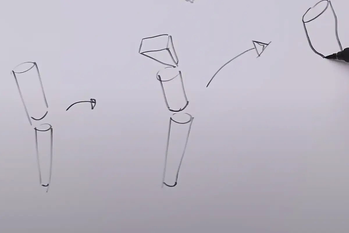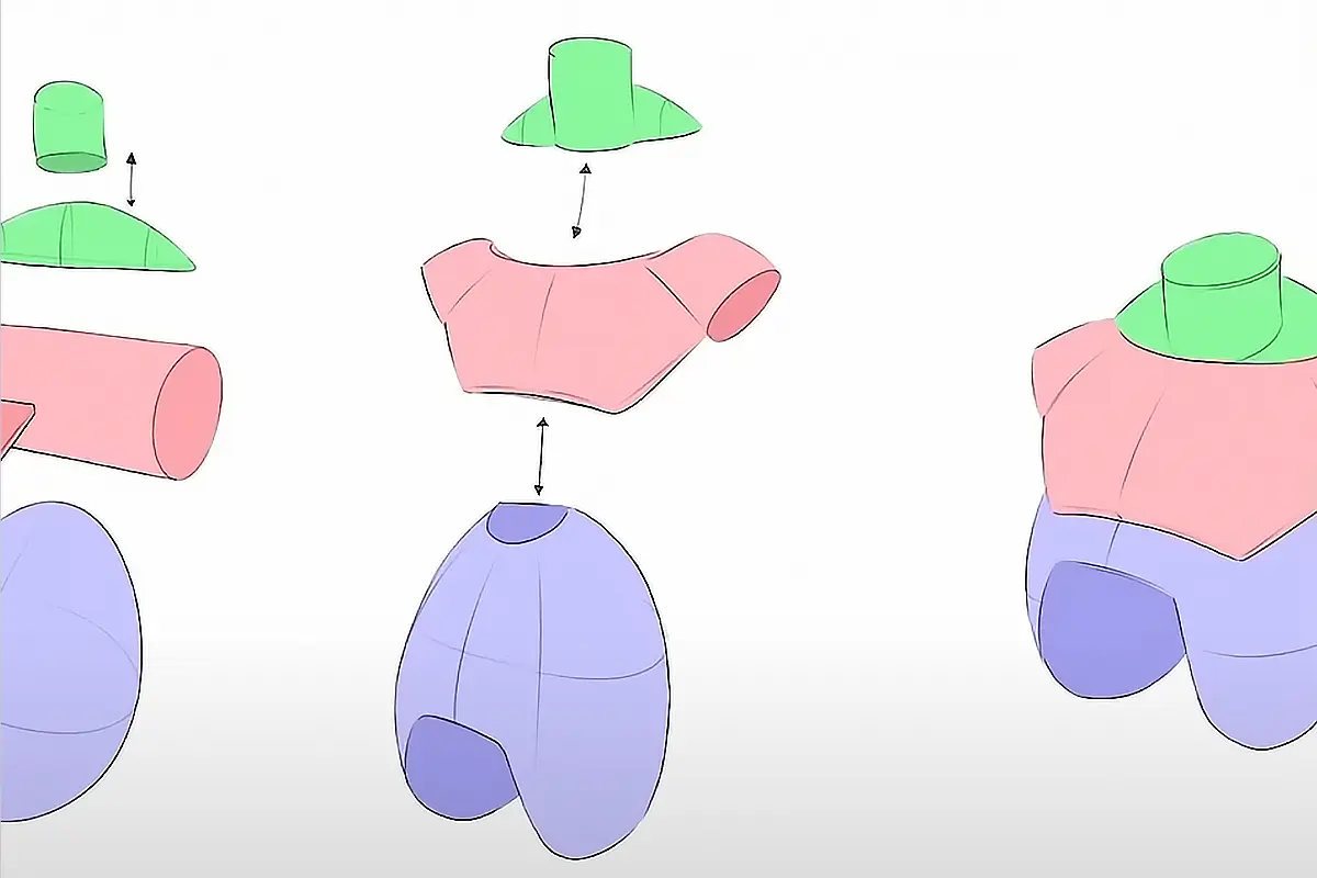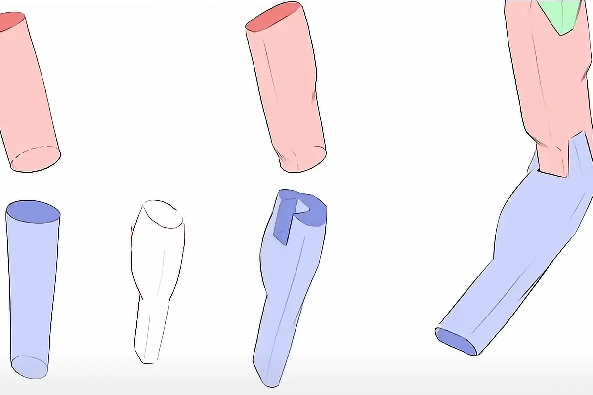 Não tente aprender o corpo inteiro de uma vez! Em vez disso, divida a anatomia em partes menores (braços, ombros ou torso). Comece desenhando um manequim — uma versão simplificada do corpo — e adicione complexidade gradualmente. Por exemplo, o braço pode ser representado por dois cilindros (um afunilado, um irregular) e o ombro como uma caixa manipulada.