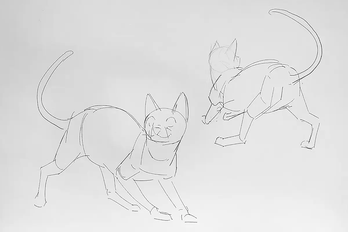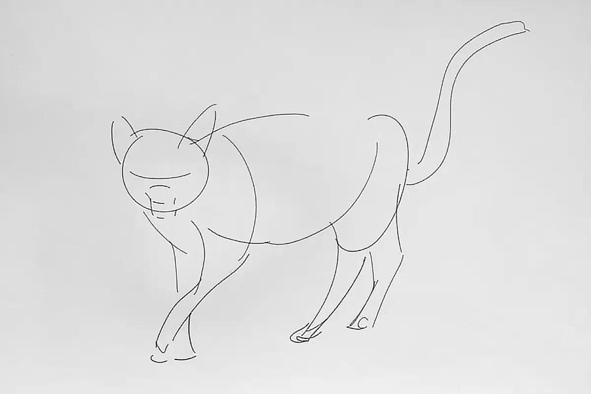 Agora que você tem uma ideia de como um gato é simplificado, é hora de voltar a desenhá-lo, mas de imaginação! Nós praticamos isso girando-o em um ângulo diferente do traçado que fizemos antes!