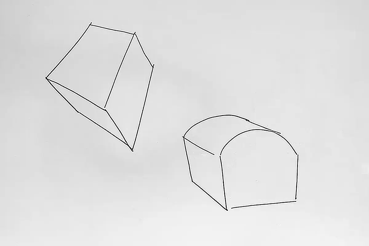 Queremos começar essa jornada com formas simples. Primeiro, desenharemos uma caixa simples e, depois de ter ela pronta, desenhe outra, mas que pareça um pão com a parte superior curva!