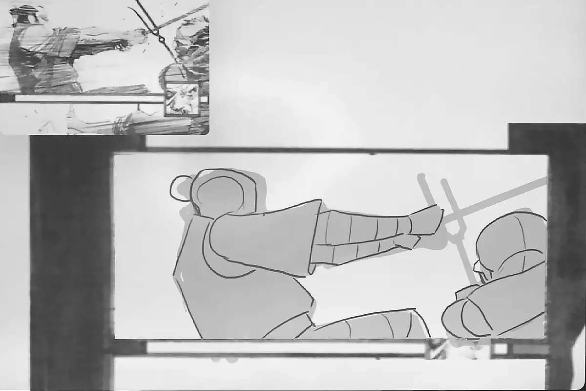 Agora, pegue essas grandes formas gráficas e desenhe sobre elas com formas simples, como manequins É uma boa prática para ver as coisas de forma simples. Dividir coisas em formas simples é um superpoder para artistas! Ajuda a desenhar o que você quiser, como os profissionais.