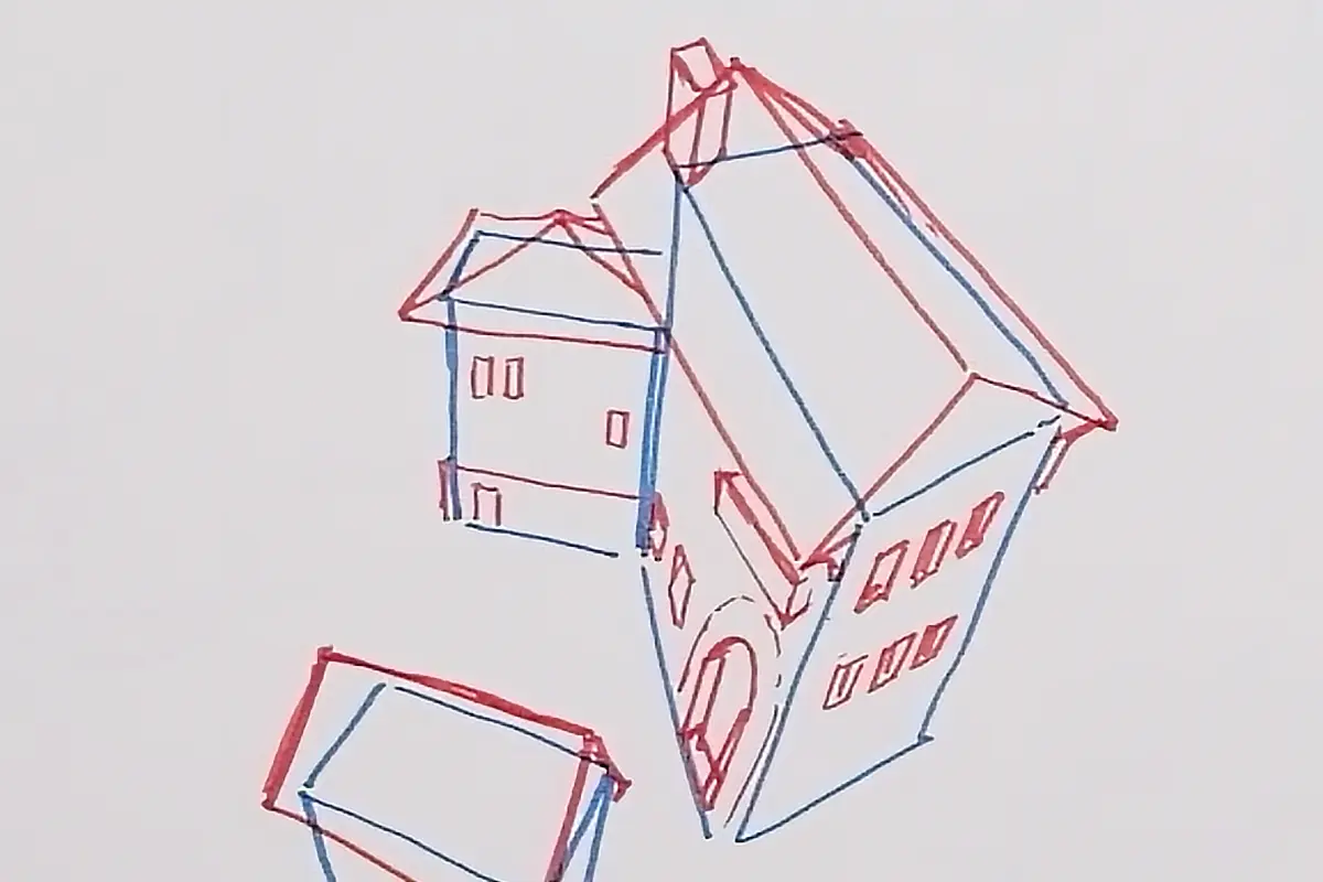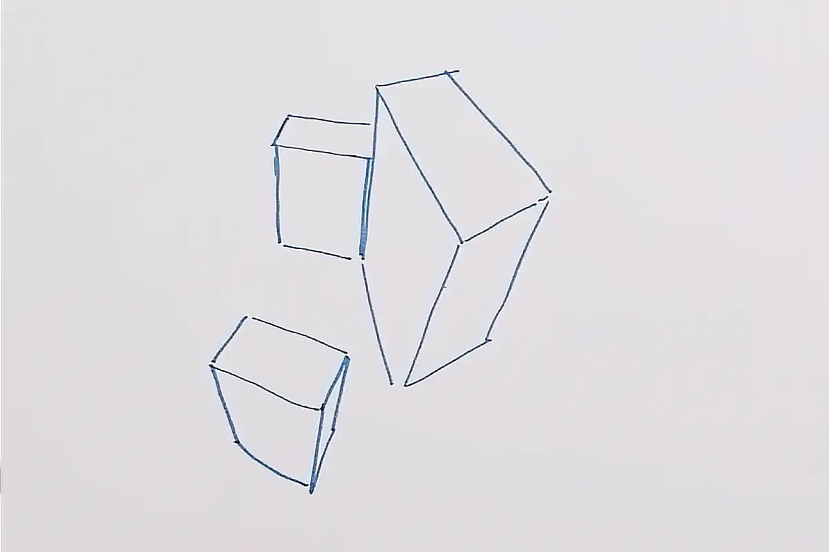 A primeira coisa a ser abordada é a perspectiva — é a base do desenho de construções! Se você tem dúvidas com perspectiva, confira nosso roteiro para iniciantes com aulas gratuitas. Quando estiver pronto, pratique desenhar amontoados de caixas em diferentes ângulos e perspectivas. Esses grupos devem parecer pertencerem um ao outro, quase como um pequeno bairro. Não se preocupe com a perfeição, apenas experimente e divirta-se!