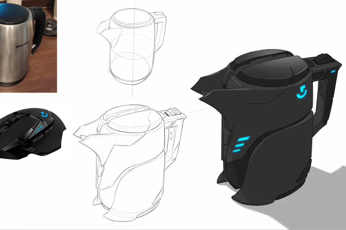 Desenhar um design de produto é sobre decompor, montar e ver como as peças se encaixam no espaço 3D. Como tarefa bônus, pegue outro objeto doméstico, comece desenhando-o e tente combinar os 2 em um novo design interessante!